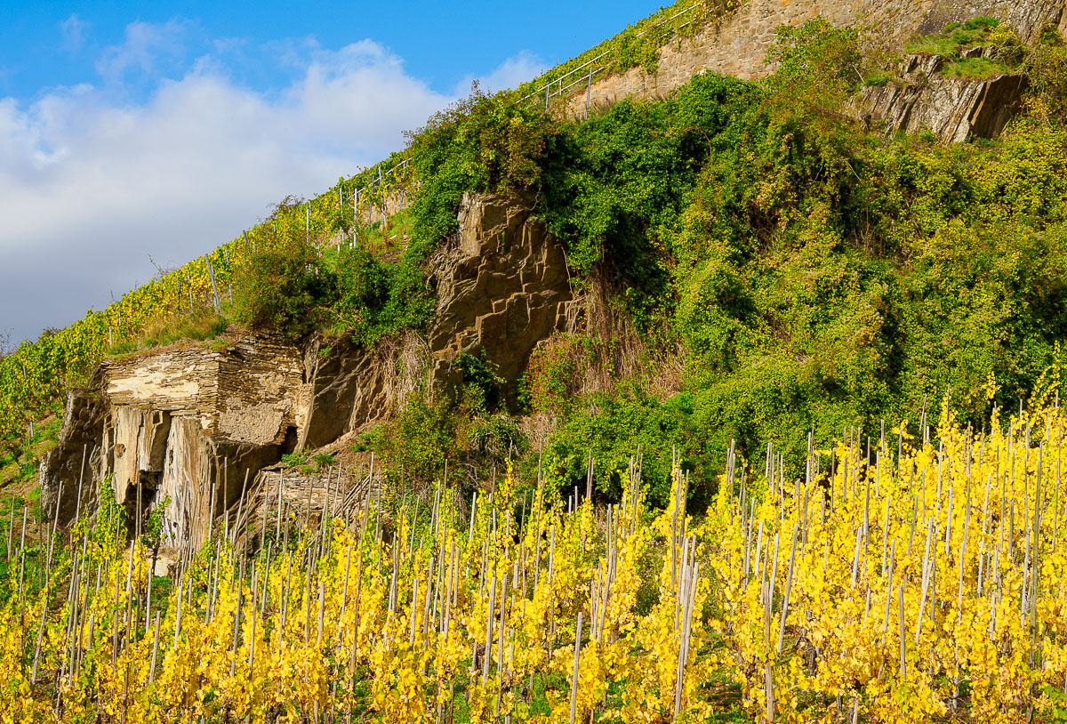 Die Weinernte war dieses Jahr so früh wie noch nie, schon ab August wurden die Trauben gelesen. Die Rebstöcke tragen aber noch einen Teil des Laubs, herbstlich bunt. Und immer wieder verläuft dazwischen eine Zahnradbahn.